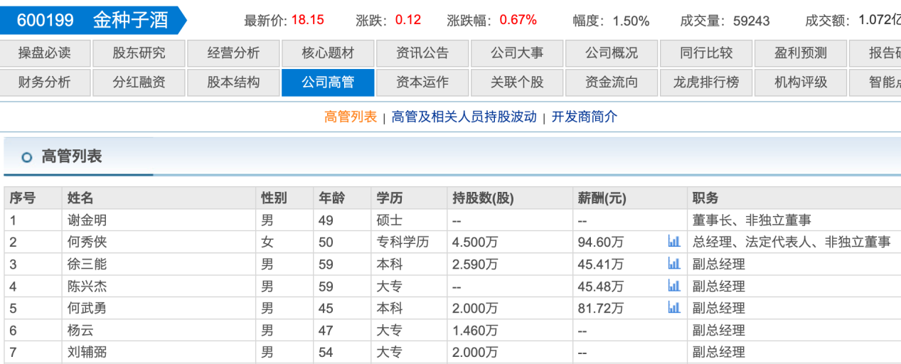 东方财富网信息显示,金种子酒目前总经理仍为何秀侠,专科学历,年薪约95万。