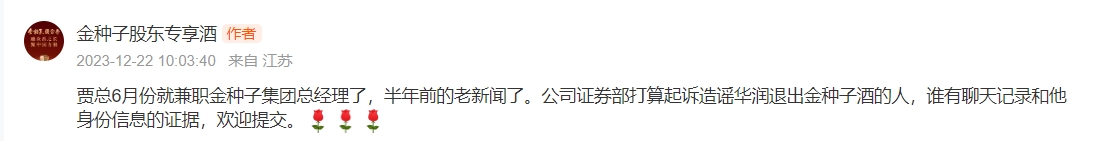 “金种子股东专享酒”还补充道,“贾总6月份就兼职金种子集团总经理了,半年前的老新闻了。公司证券部打算起诉造谣华润退出金种子酒的人,谁有聊天记录和他身份信息的证据,欢迎提交”。