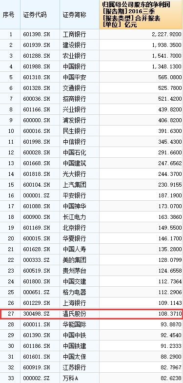 除了与创业板的其他公司拉开距离,温氏股份2016年的业绩也将跻身沪深上市公司前列。据Wind数据统计,2016年三季度,温氏股份的归属净利润在全部A股公司中排在第27位,紧跟在格力电器(000651.SZ)、上海银行(601229.SH)之后。