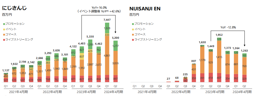 面向英语圈的NIJISANJI EN方面,由于今年以来不少日本粉丝将兴趣转向了日本VTuber,导致粉丝消费持续出现下降,销售额26.26亿日元,同比下降14.7%。
