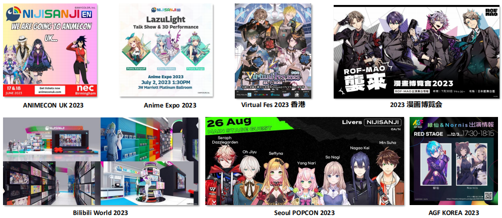 彩虹社旗下虚拟主播参与的展会,包括“Bilibili World 2023”“ANIMECON UK 2023(英国漫展)”“Anime Expo 2023(洛杉矶动漫展)”等。