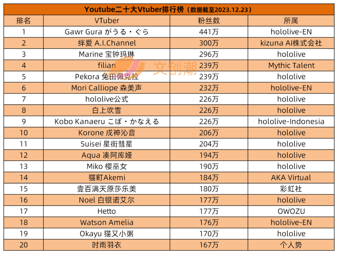 与去年的TOP20相比,2023年的榜单人员并未出现较大变化。回顾文创潮去年的文章:从主播到IP,VTuber在2022高速增长