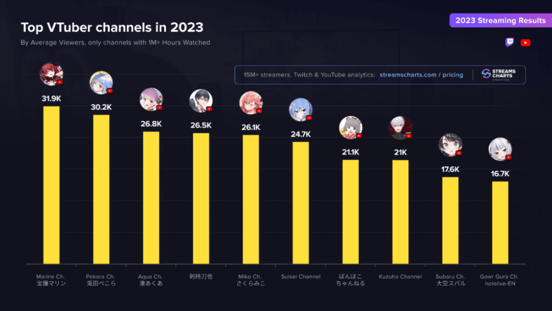 2023年VTuber直播平均同接数TOP10 来源:Streams Charts