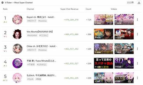 不过,文创潮注意到,据Playboard数据,2023年打赏收入TOP5依次为hololive-博衣小夜璃(收入7818.4370万日元)、彩虹社-Vox Akuma(收入6647.1086万日元)、hololive-沙花叉库洛艾(收入6191.7352万日元)、彩虹社-不破湊(收入5203.1517万日元)、青桐高中-千代浦蝶美(收入4995.1195万日元),无一人进入了人气TOP20。