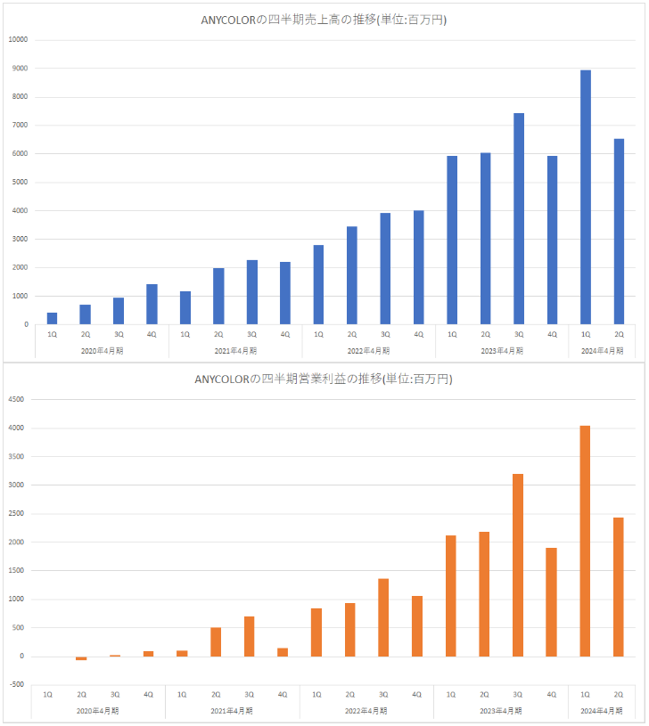 彩虹社/ANYCOLOR销售额和营业利润季度推移
