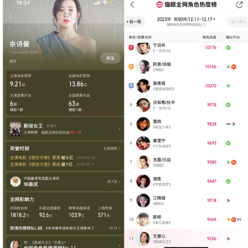 佘诗曼人气。来源:猫眼专业版