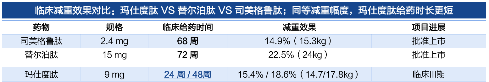 国金证券研报对比玛仕度肽与替尔泊肽、司美格鲁肽的临床减重效果显示,同等减重幅度,玛仕度肽的给药时长更短。