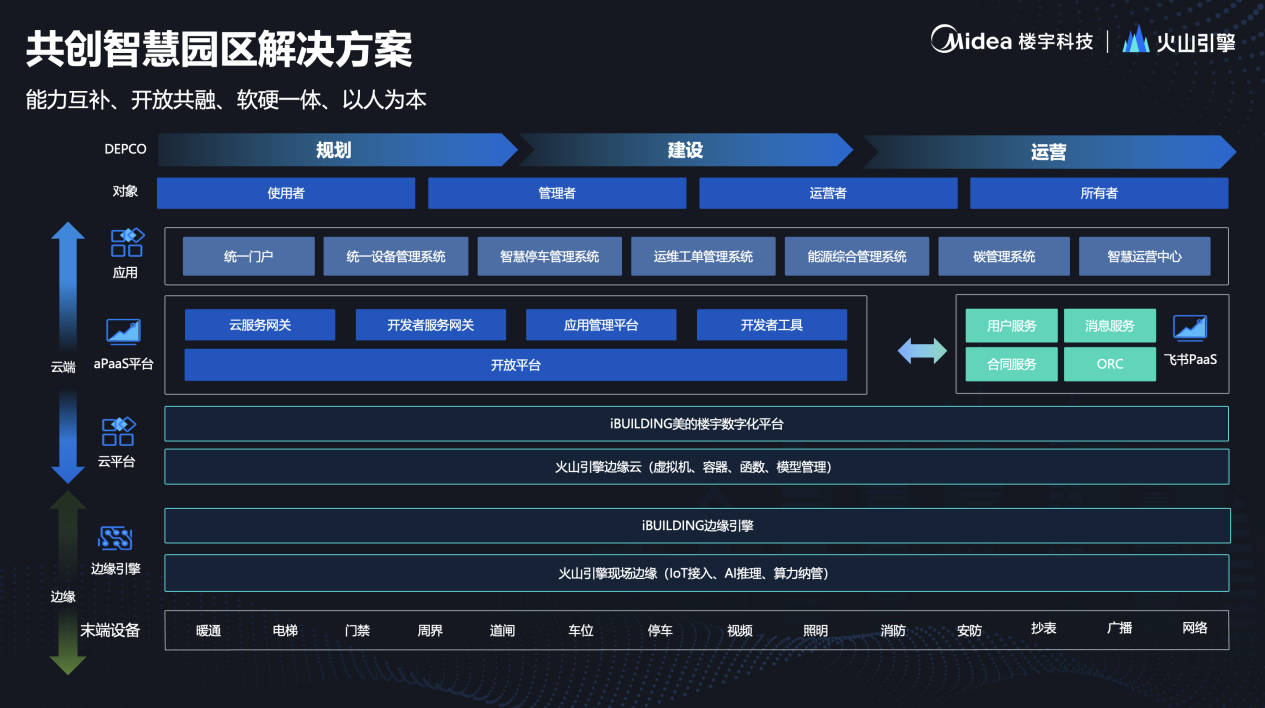 在这个解决方案中,火山引擎作为云技术合作伙伴,通过边缘引擎现场边缘以及边缘云提供从边缘到云的云核心技术底座支撑,为末端、到云、到应用提供云基础设施及算力支撑,减少数据传输的延迟和网络拥堵,可以实现各应用更快地响应用户需求,根据机房位置部署,最快可提供高达0.1毫秒的响应延时;而美的楼宇科技作为智慧建筑合作伙伴,以智慧建筑数字化总承包(DEPCO)模式,提供基于iBUILDING的“软硬一体”智慧园区综合方案,覆盖建筑全生命周期、全用户、云边端全架构,助力智慧园区全生命周期价值链闭环的实现。