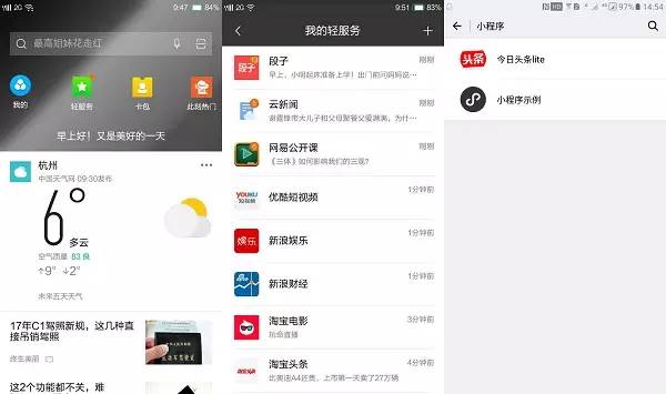 微信的小程序相对于YunOS而言抓的则是另一端,从人的维度出发,通过本身的社交粘性帮助用户寻找更便捷的服务。不可否认的是,微信小程序正如业内众多人判断的那样,肯定会有巨大的商业空间。它最大的有点事摆脱了对硬件的依赖,通过微信的账号体系,它可以建立更具想象力的人和服务的连接。比如我们走进餐厅,微信可以弹出点餐小程序;当我们购物支付的时候,可以扫下弹出需要支付的清单一键支付,甚至增添或者删减购物车的商品……甚至不排除未来微信会成为顶级的服务入口。