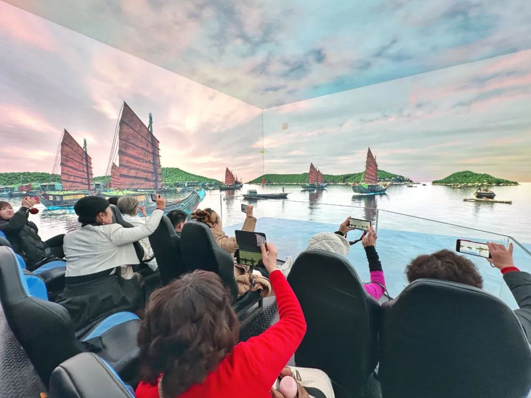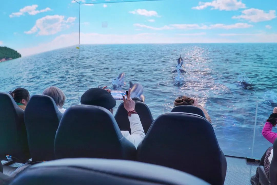 随后,旅居体验官们一起体验了极具科技沉浸式空间的“渔海时空”,500多平方米的播放画面,由5面LED显示屏拼接而成,座椅采用了振动风动平台。