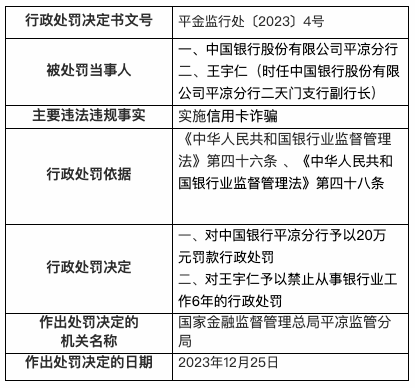 12月27日,国家金融监督管理总局平凉监管分局行政处罚信息公开表显示,2023年12月25日,中国银行股份有限公司平凉分行因员工实施信用卡诈骗,被处罚款20万元;时任中国银行股份有限公司平凉分行二天门支行副行长王宇仁被禁止从事银行业工作6年。