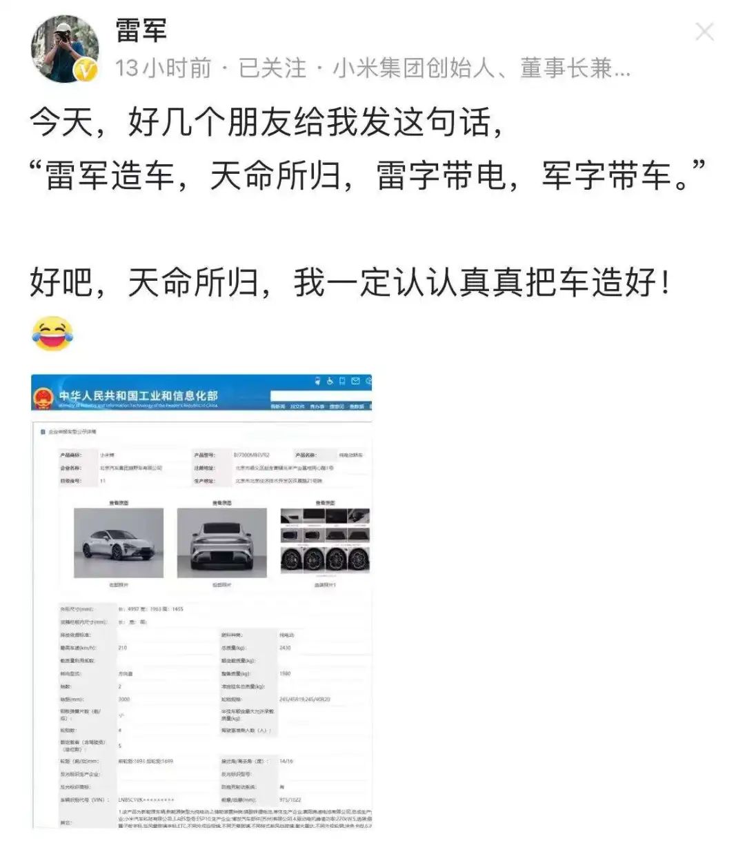 内容是圈内老师写的,本意是戏谑调侃。不曾想,雷军发布到微博,引起轰动。原文是,“雷军造车,天命所归,雷字带电,军字带车”。后来可能是经人提醒,感受到“天命所归”自带的热气腾腾的杀气,就删掉了。