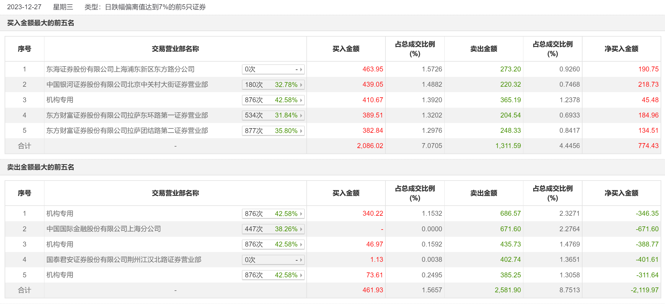12月27日,华斯股份今日跌停,全天换手率达17.94%,振幅达6.51%。龙虎榜数据显示,营业部席位合计净卖出1345.54万元。其中,机构买入871.46万元,卖出1872.75万元,合计净卖出1001.28万元。此外,中国国际金融上海分公司、国泰君安证券荆州江汉北路证券营业部分别卖出671.60万元、402.74万元;东海证券上海浦东新区东方路分公司、中国银河证券北京中关村大街证券营业部分别买入463.95万元、439.05万元。