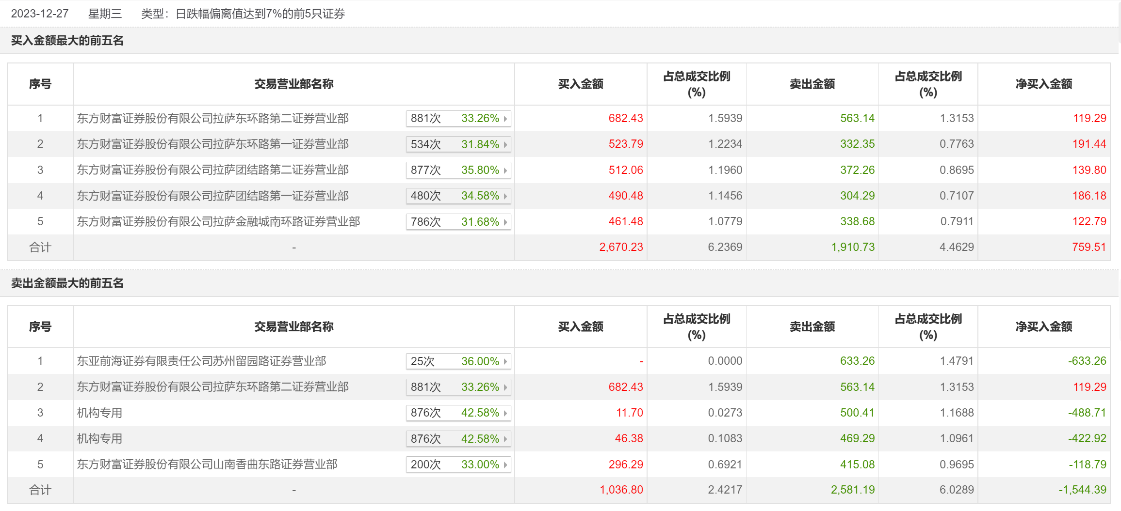 12月27日,宁波东力今日跌停,全天换手率达14.65%,振幅达4.04%。龙虎榜数据显示,营业部席位合计净卖出904.16万元。其中,机构买入58.08万元,卖出969.7万元,合计净卖出911.62万元。此外,东亚前海证券苏州留园路证券营业部、东方财富证券拉萨东环路第二证券营业部分别卖出633.26万元、563.14万元;东方财富证券拉萨东环路第二证券营业部、东方财富证券拉萨东环路第一证券营业部分别买入682.43万元、523.79万元。