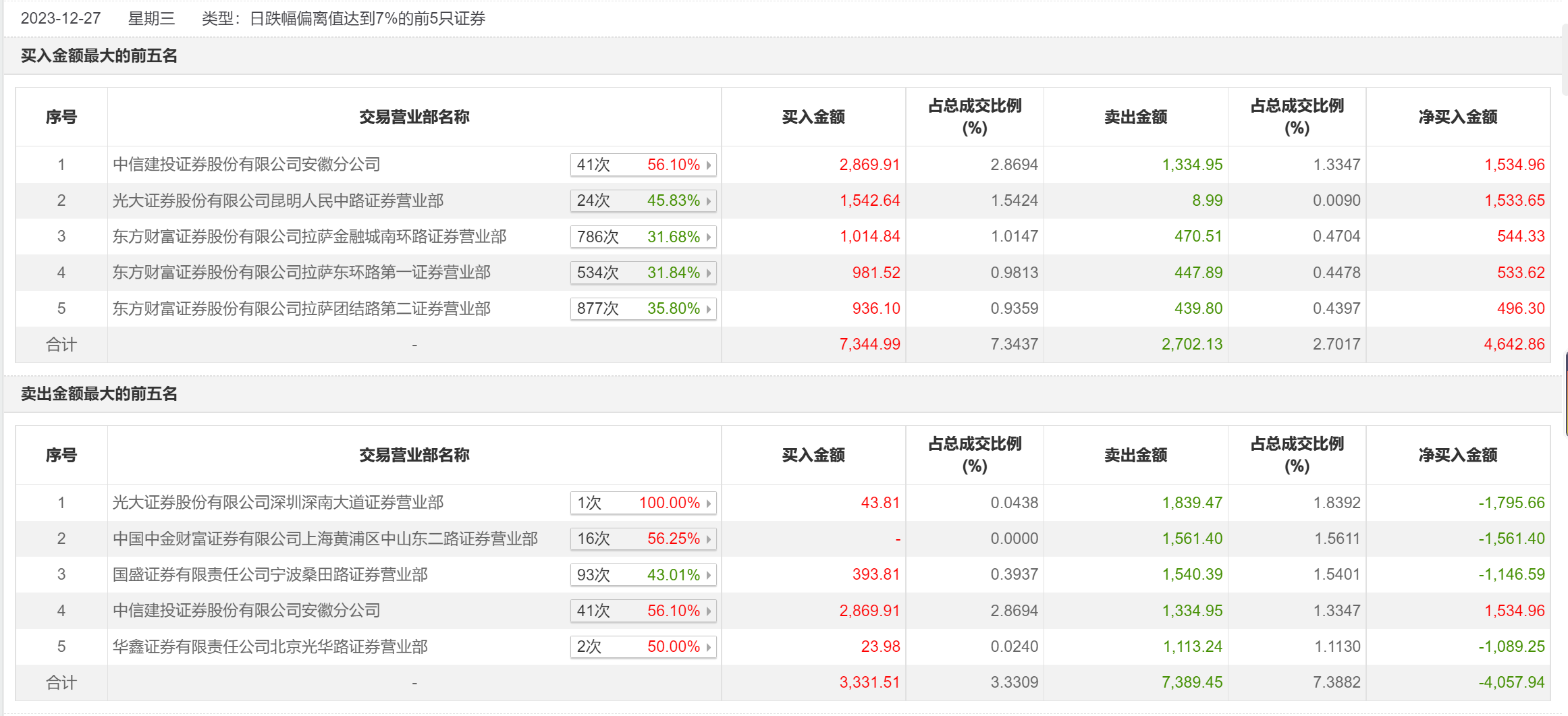 12月27日,世龙实业今日跌停,龙虎榜数据显示,上榜营业部席位全天成交1.66亿元,占当日总成交金额比例为16.56%。其中,买入金额为7806.6万元,卖出金额为8756.64万元,合计净卖出950.04万元。