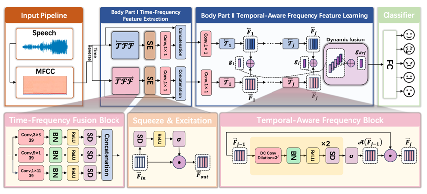 情感计算领域是一个涉及计算机科学、心理学和语言学等多学科的交叉研究领域,它的主要目的是通过分析和处理语音信号中的情感信息,使计算机能够识别和理解人类的情感状态。业界主流做法是通过音频、文本等多模态信息来进行情感分类,但奇富科技团队认为人类底层情感特征是相通的,是完全可以跨越具体语种和文本内容。奇富科技团队认为可以从减少提取大量无关紧要的声学特征和针对局部频率和长期时间特征进行融合两方面去提升语音信号的情感表征学习,并基于此提出了MS-SENet框架(图1)。MS-SENet通过使用不同尺寸的卷积核提取多尺度时空特征,并引入压励模块来有效捕捉这些多尺度特征。同时通过跳跃连接和空间丢失层防止过拟合并增加模型深度,进一步提高了情感计算模型的表达能力。