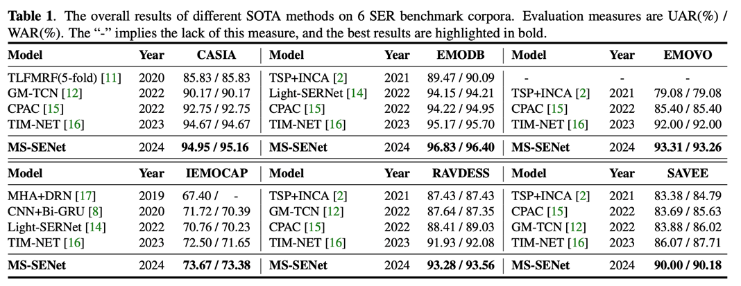 奇富科技团队在论文中评估了包括中科院自动化所语音情感数据集、柏林情感数据库、意大利语数据集、互动情感二元运动捕捉数据库、Surrey音频视觉表达情感数据集以及Ryerson音频视觉情感演讲与歌曲数据集在内的六个不同场景的多语种的数据集。和SOTA(state of the art,是指在特定任务中目前表现最优的方法或模型)相比,MS-SENet将UA和WA提高了1.31%和1.61%,同时MS-SENet在具有更多情感类别和较低数据量的情况下,仍然保持着出色的情感识别能力。