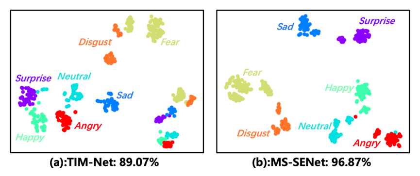 奇富科技团队还利用t-SNE技术对MS-SENet和SOTA模型(TIM-Net)的表征进行了可视化,从下图可以观察到MS-SENet形成了具有清晰分类边界的独特表征聚类。