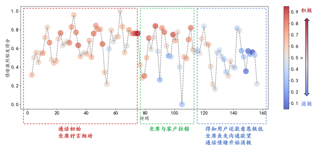 此外,奇富科技大模型部自研的Orpheus-声学感知系统(Orpheus Acoustics Perceptual System,以下简称Orpheus-APS)中已成功地整合情感计算模块,该系统着重聚焦声学环境、音频内容和说话人三大感知维度,提供了崭新的智能外呼平台交互质量评估视角。例如,在质检场景中,Orpheus-APS不仅具备传统声学检测功能,更以其情感感知能力为亮点。与市面上已有简单的单句维度情感分类不同,Orpheus-APS可以在时间维度绘制连续的完整情绪光谱,更直观呈现说话者在通话过程中情绪状态的连续变化。情绪光谱的绘制精准反馈了坐席在通话过程中的情绪波动和趋势,为质检人员提供了全新的观察角度,也为企业利用好海量通话交互数据提供了全新的工具,是实现业务管理决策、战略规划数智化过程中重要的一步。