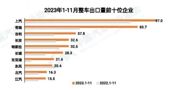 △2023年1-11月整车出口量前十企业 图片来源:中汽协