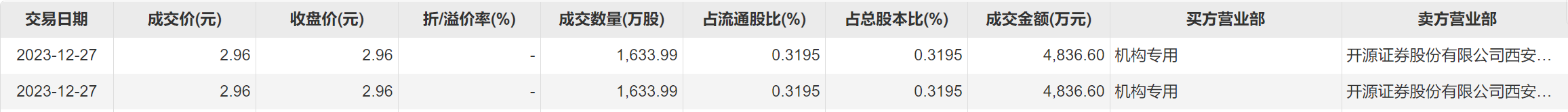 12月27日,陕国投A今日大宗交易成交3267.98万股,成交额9673.2万元,占当日总成交额的57.86%,成交价2.96元,较市场收盘价持平。