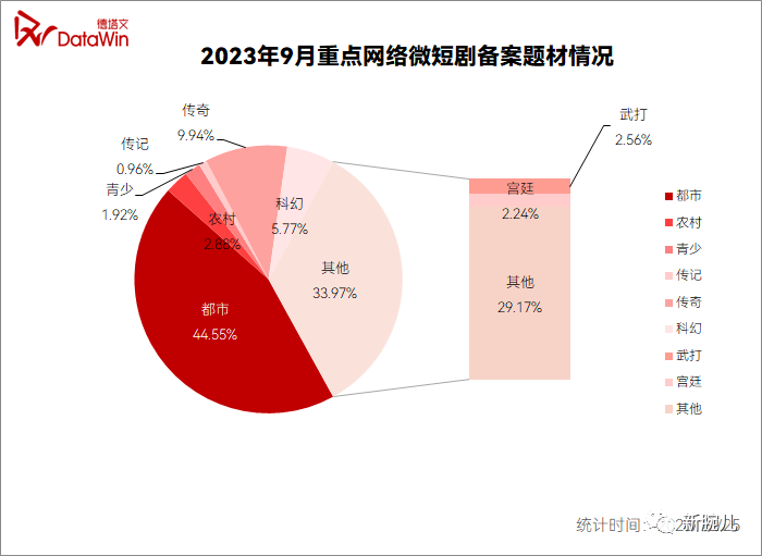 据德塔文对2023年1-9月的统计,在国家广电总局备案的微短剧数量2007部,其中9月份备案的312部中,都市题材占据本月备案微短剧总量的44.55%。