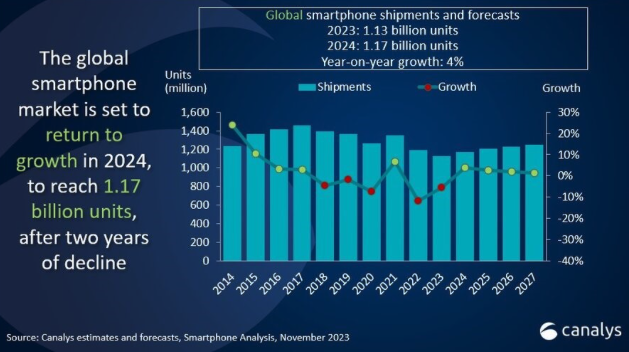 Canalys最新预测:2024年全球智能手机市场将增长4%,达到11.7亿部……