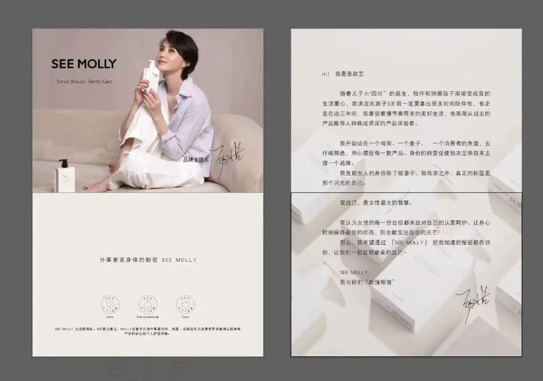 SEE MOLLY品牌于2021年12月官宣成立,女演员张歆艺任主理人。品牌名意为看见自然、纯真,宣称为消费者带来看得见的净彻产品和安心的个护体验。在品牌官宣成立的文章中,张歆艺写道,“她会站在母亲、妻子、消费者的角度筛选、感受产品,身份的转变促使她成为品牌主理人。”