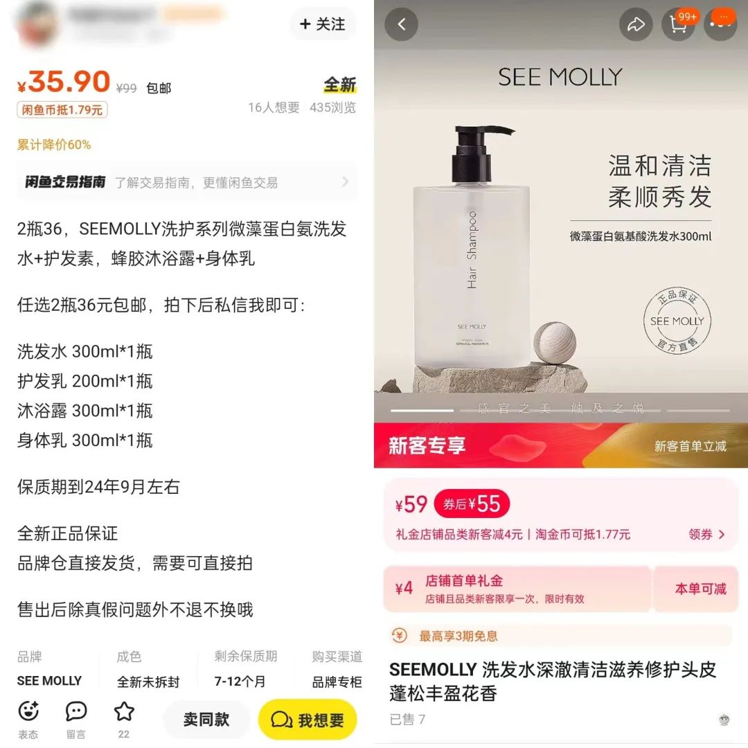 从品牌经营来看,SEE MOLLY在天猫的店铺已经闭店,无法被搜到,仅有淘宝C店和私域渠道仍在折价售卖相关产品,如在淘宝有店铺以29.9元至39.9元的价格售卖其临期护发素、洗发水产品,已售超百件。