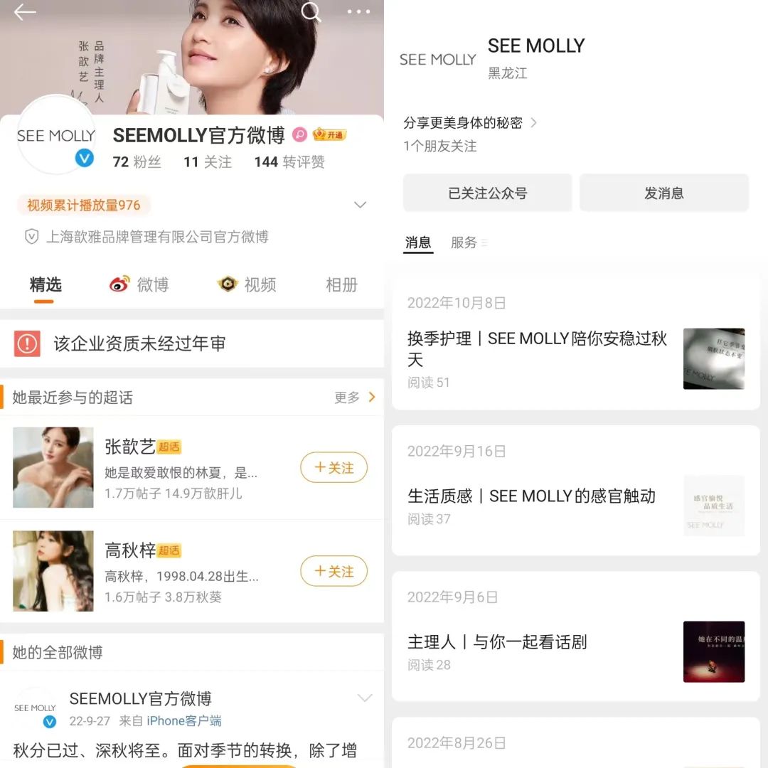 作为品牌主理人,张歆艺在SEE MOLLY的官方账号上多有露面,但目前,在其个人微博、小红书等社交账号上,却很少看到品牌相关宣传内容,仅在小红书上可以看到品牌上市时,其发布的宣传内容。