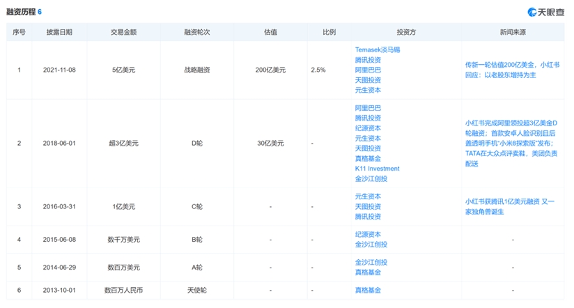 最后一轮融资停留在了2021年,投资方包括淡马锡、腾讯、阿里、天图投资、元生资本,此轮投后,小红书估值升至200亿美元。在此前的融资历程中,融中财经记者发现,该公司投资方还包括真格基金、金沙江创投等知名公司与机构,腾讯更是连投3轮。