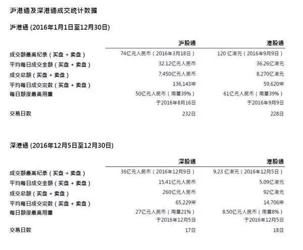 香港交易所今日公布2016年全年统计数据,恒生指数去年全年企稳22000点。去年12月5日深港通开通,沪港通继续平稳畅顺运作。截至12月30日,南向港股通成交总额为8362亿港元,北向沪股通及深股通成交总额为人民币7710亿元。