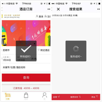 也有即使是刷存在感也不是特别认真的开发者。比如速8的酒店订房小程序,首页滚动的几个广告只能显示一半的内容,并且根本点击不进去。进入小程序界面后,也会经常出现“网络超时”“服务超时”这样的bug。