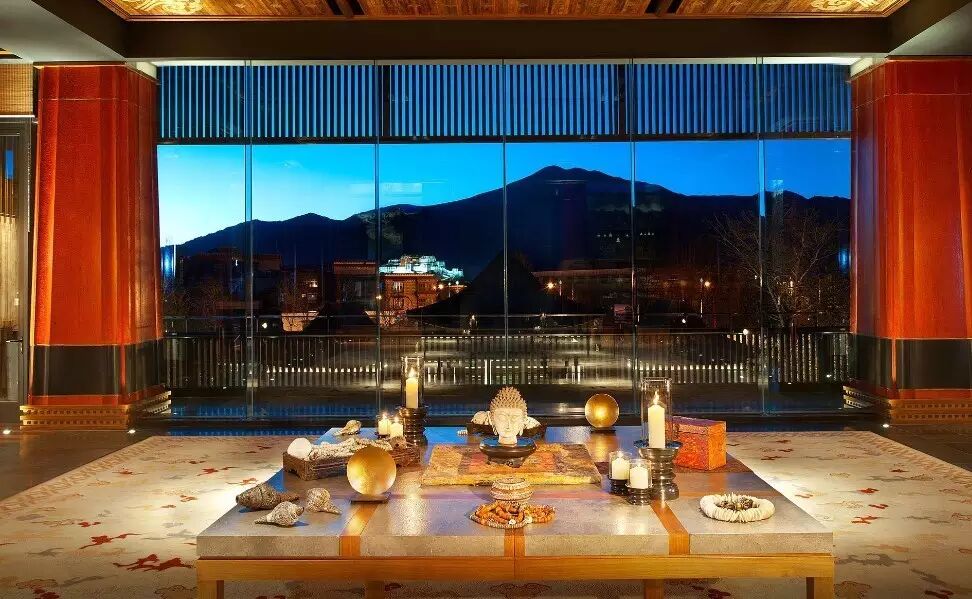 还有那朱砂红方形立柱,也被“搬”进酒店的大堂,瞬间平添了不少巍峨气势,更形成天然画框,框住玛布山上那万民膜拜的布达拉宫。