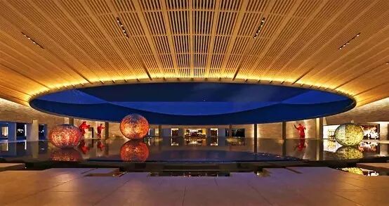 中国人讲究风水,故此酒店大堂中央设计成大的圆形“水池”,而天顶是镂空的,下雨时,雨水直接滴落在水池里,雨帘会像瀑布一样挂在大堂中央,不仅宛如天然装置艺术品,更寓意好风水。