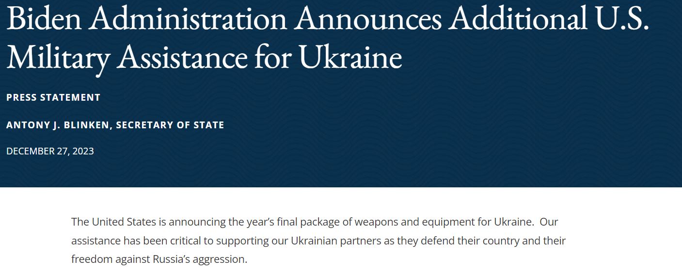 美国国务院12月27日发声明宣布,最新的2.5亿美元对乌军事援助包括防空导弹、反装甲弹药等。这也是今年美国为乌克兰提供的最后一批武器援助,美国务院敦促国会尽快采取行动批准对乌新援助。