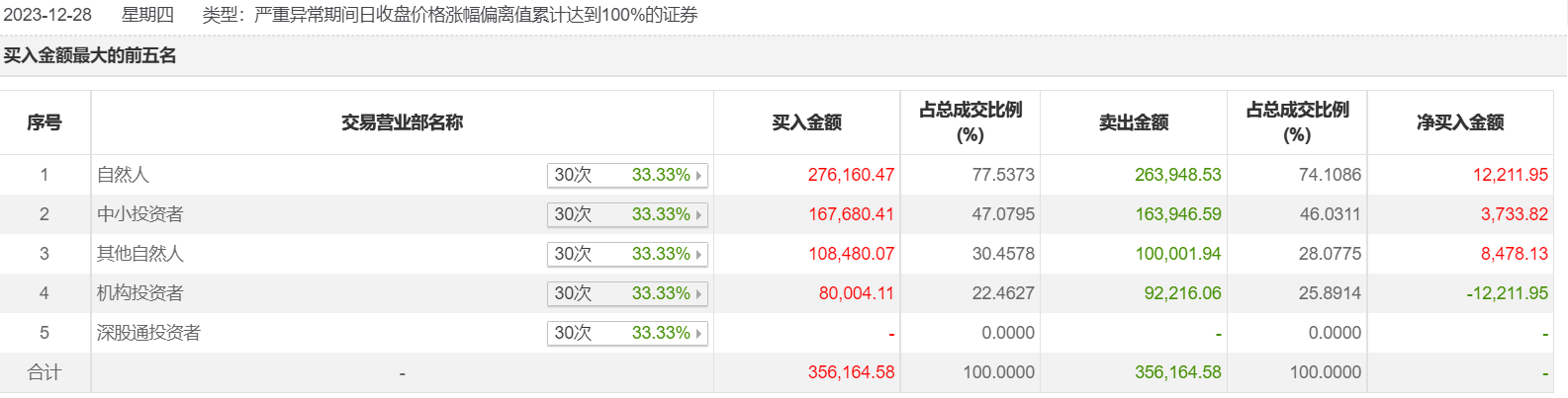 从2023年12月28日的龙虎榜数据看,当日个人投资者成为炒作的主体。自然人买入金额就高达27.61亿元,卖出金额高达26.39亿元。