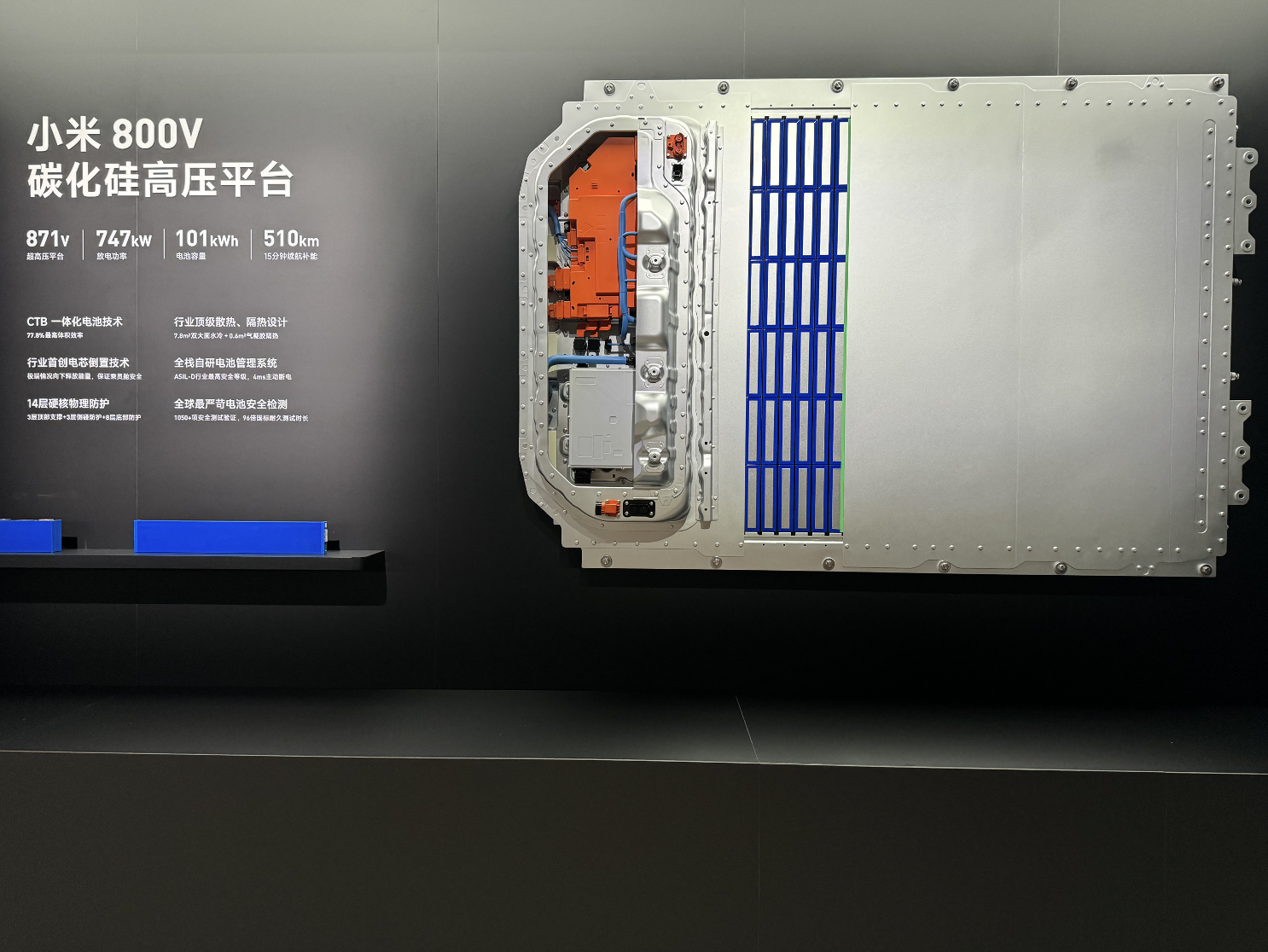 小米汽车的800V碳化硅高压平台最高电压达到了871V,该电池包由宁德时代负责制造,采用小米自研CTB电池技术,体积利用效率达到77.8%,续航可达1000公里。