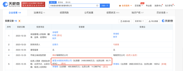 天眼查App显示,近日,极拉图冰淇淋关联公司河南爱彼家餐饮管理有限公司发生工商变更,公司市场主体类型由其他有限责任公司变更为有限责任公司(自然人独资),同时,蜜雪冰城股份有限公司退出股东行列,退股前持股比例约85.71%,该公司现由极拉图创始人李增辉全资持股。