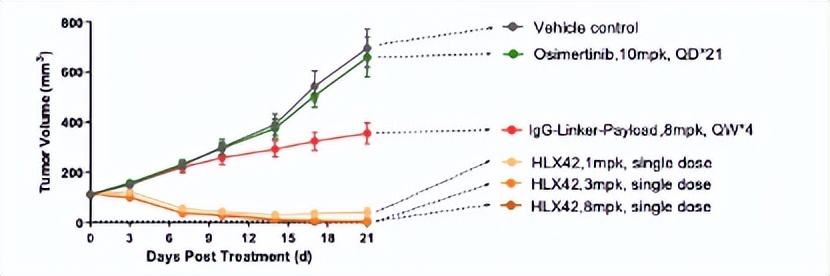 首先,在奥希替尼的耐药模型中,HLX42展现了良好的治疗效果。具体来看,针对奥希替尼完全耐受的肺癌PDX模型中,最低剂量的HLX42单次给药就可实现肿瘤的完全缓解。