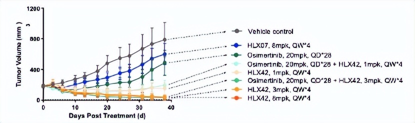 并且,HLX42与奥希替尼联用还有增效的作用。如下图所示,HLX42、奥希替尼联合疗法的效果,要显著优于奥希替尼单药模型。