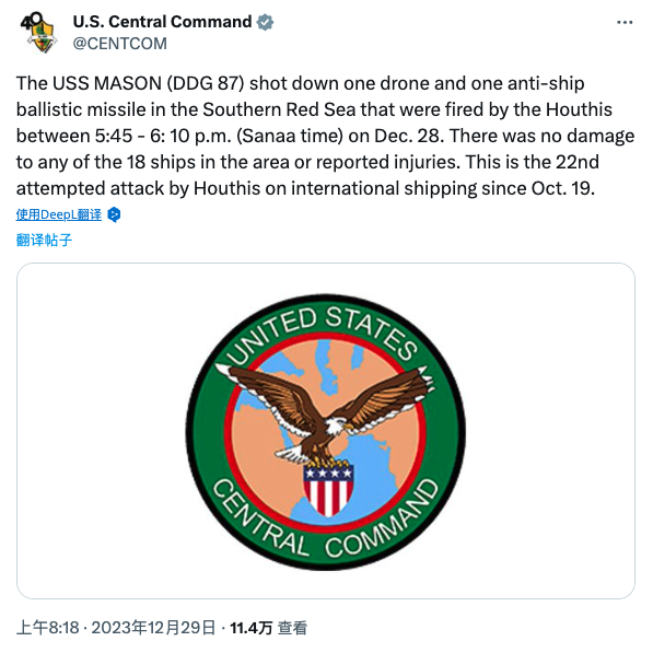 美国中央司令部(U.S. Central Command)在社交媒体平台X上表示,也门时间12月28日17:45至18:10之间,胡塞武装在红海南部发射了一架无人机和一枚反舰弹道导弹,美军将其击落,位于该海域的18艘船只没有受损或报告人员受伤。
