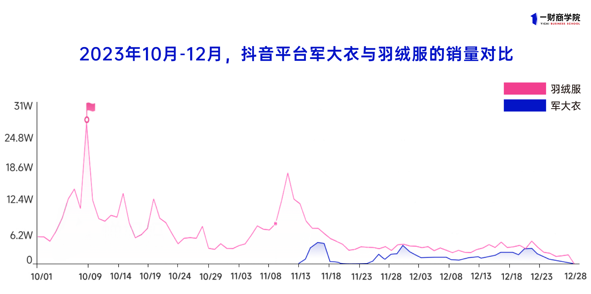 但流量以外,军大衣的爆火真的带动了销量吗?一财商学院发现,这个“羽绒服平替”只抢占了流量高地,但实际上,它只贡献了冬衣类目中相当小的营收。不管是从短期内的实际销量,还是长期对羽绒服或棉服的可替代性来看,军大衣的“商业价值”都很有限。