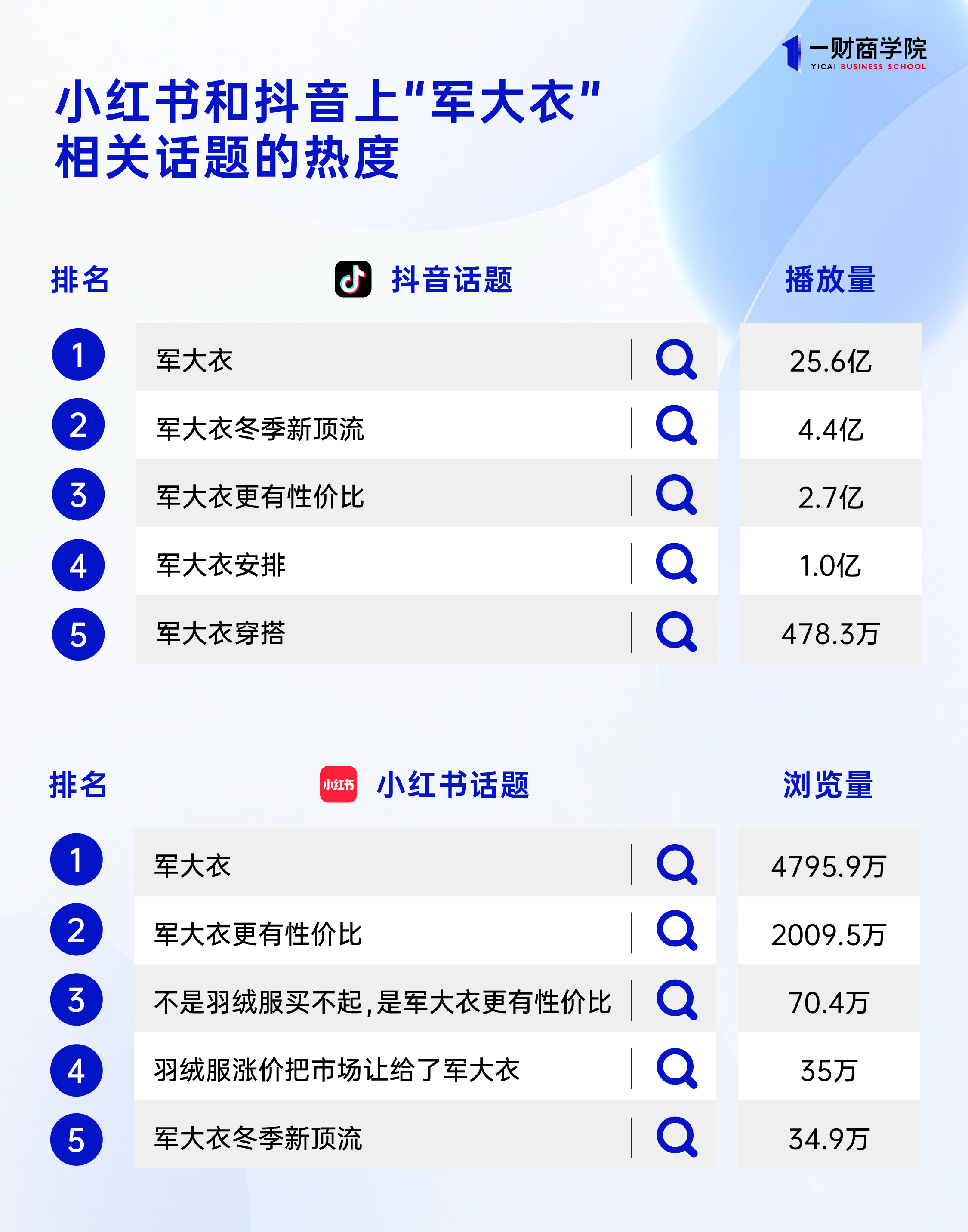 “土到极致就是潮”,军大衣在小红书、抖音等以内容为驱动的平台上,已经成为一件时尚单品。军大衣相关话题下出现一批如“性价比”、“冬季新顶流”、“大学生”、“时尚”、“穿搭”等衍生话题。多个话题浏览量数亿,军大衣成了当之无愧冬日新晋顶流。
