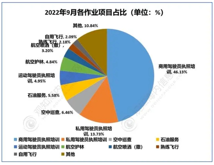 根据观知海内信息网2022年9月通用航空各作业项目占比情况,通用航空仍然多用于培训与农林,这是由于四川(培训——主要是公共运输而非通用航空)与黑龙江(农林)是我国主要的通用机场聚集区,付费群体市场化程度不高。