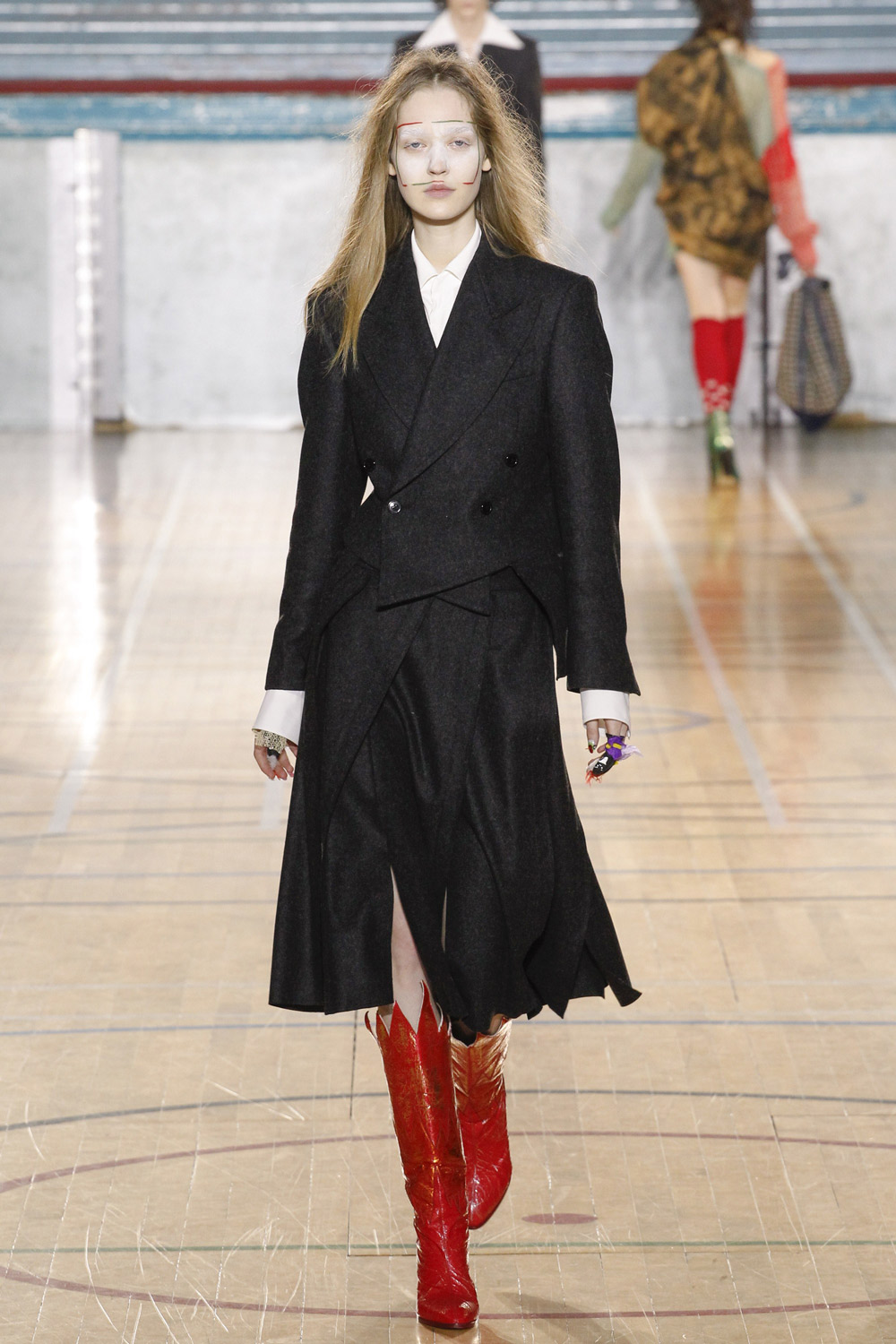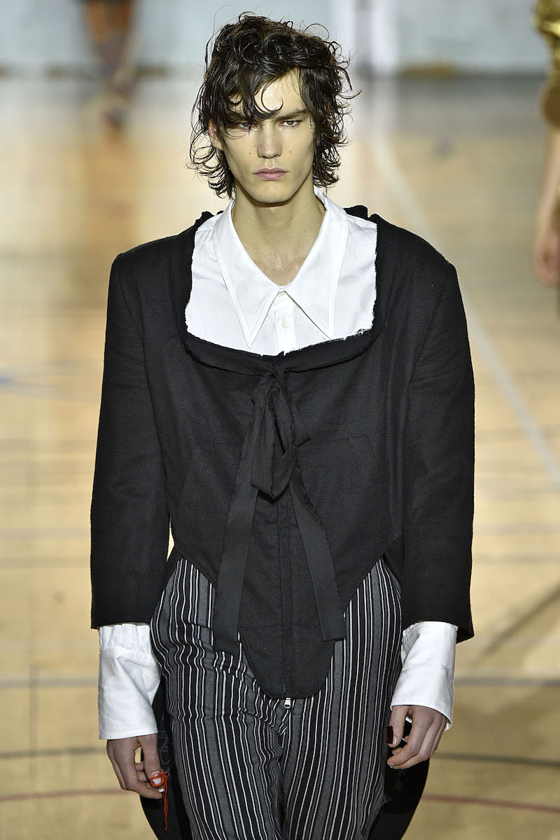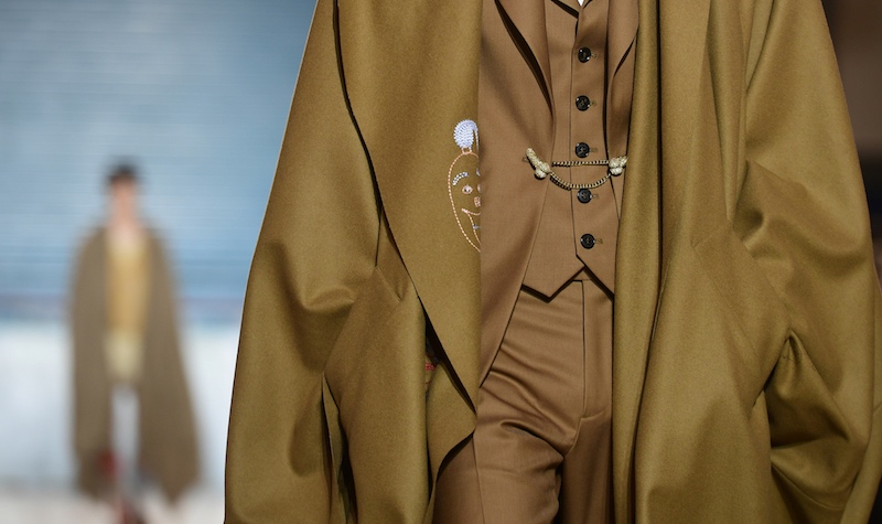 事实上,本季的伦敦时装周掺杂进了许多政治内容,足以可见英国脱欧和特朗普上台对欧洲各国的消极影响,只是不同设计师的表达方式和拿捏尺度不同。伦敦男装周第二日发布新作的设计师Matthew Miller就是以西班牙内战的游击队员为灵感,这一季他的模特们在平静的秀场举起了黑色的旗帜,上面大片的红色晕染像是战火中的蔷薇。其秋冬装中甚至出现了防弹背心的设计,黑色碎花密密麻麻地布满白色大衣,简洁的廓型中蕴含一股静默者的力量。而Maharishi也是以非洲驻军为灵感设计的,随着近年来欧洲恐怖袭击和难民潮成为社会热点话题,不难看出大家对战争的恐惧感陡然上升。