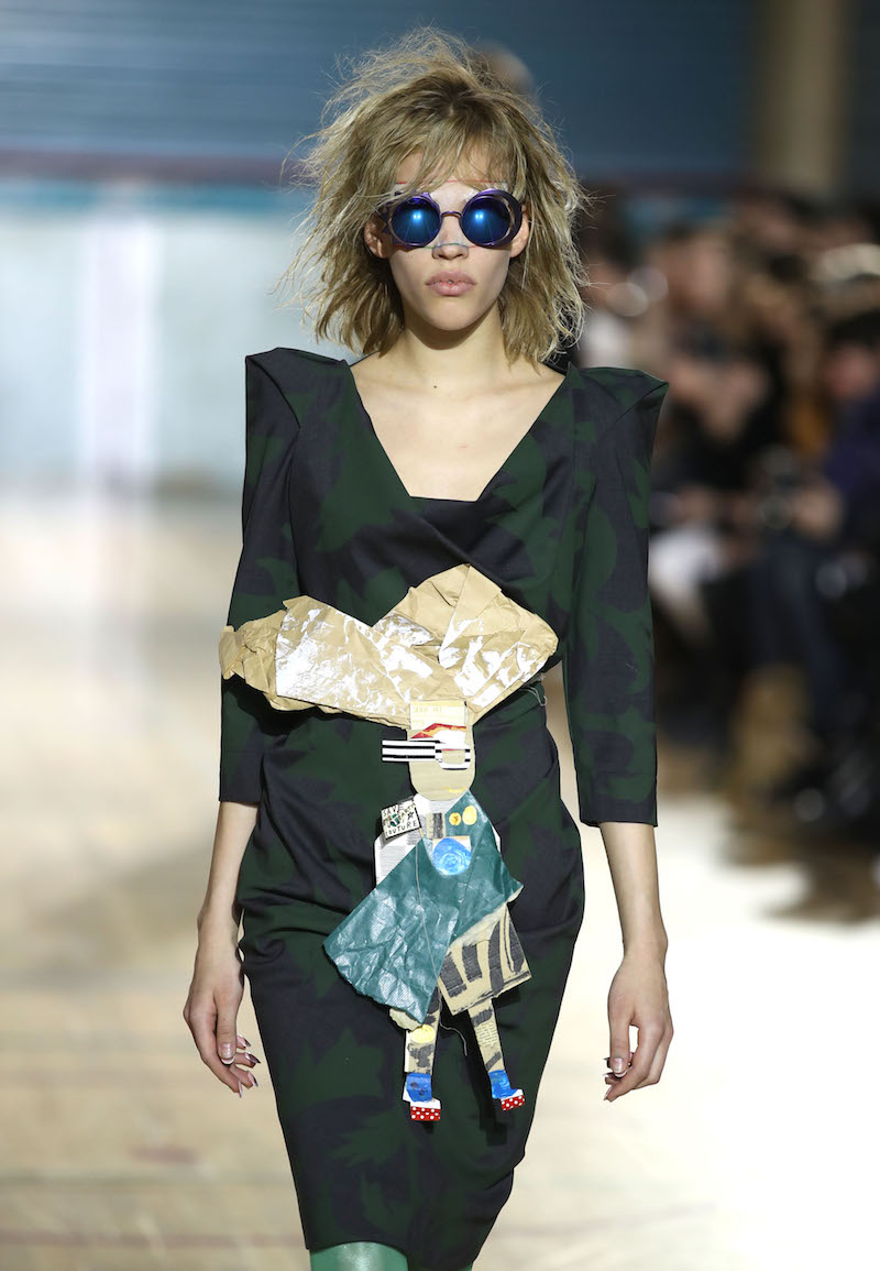 这位向来不规避社会议题的设计师再次呼吁人们走近政治,拿出发展绿色经济的行动来。关于民主投票、问责政府的信息用手写的方式印在了秀票上,看起来像极了街头游行的宣传册。而在T台上,模特们也头顶纸制的王冠,以象征节能减排。