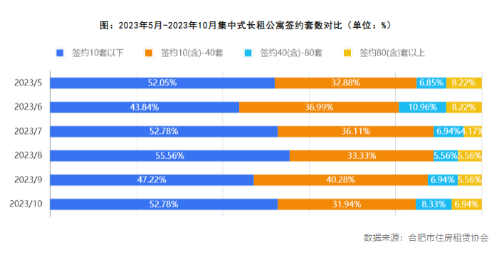 数据统计直观展现了合肥长租公寓的生命力。今年10月,合肥长租公寓项目共签约1610套。从签约套数分布来看,52.8%的项目签约在10套以下,环比上升5.6个百分点,其他签约套数类型的环比均有上升。进入到下半年,合肥长租公寓仍呈现活力态势,在住房租赁市场持续走俏。
