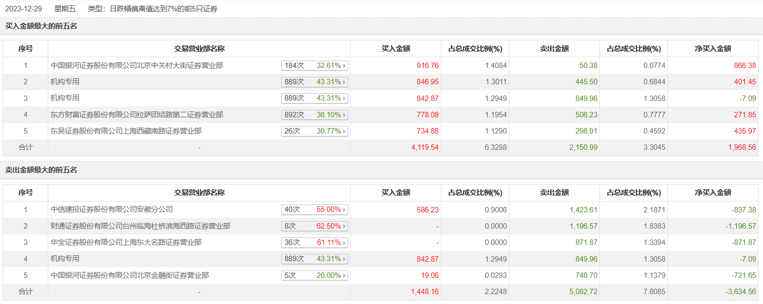 世龙实业12月29日跌停,全天换手率达22.82%,振幅达6.2%。龙虎榜数据显示,营业部席位合计净卖出1658.91万元。其中,机构买入1689.82万元,卖出1295.46万元,合计净买入394.36万元。此外,中信建投证券安徽分公司、财通证券台州临海杜桥滨海西路证券营业部分别卖出1423.61万元、1196.57万元;中国银河证券北京中关村大街证券营业部、东方财富证券拉萨团结路第二证券营业部分别买入916.76万元、778.08万元。