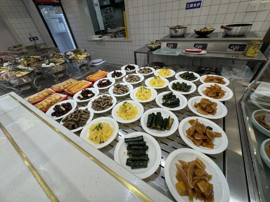 记者看到,食堂总面积近400平方米,用餐区可以同时容纳130人用餐,选餐区40多道荤素菜品琳琅满目。荤菜有家常的红烧肉、梅干菜扣肉、红烧狮子头等,素菜则有豆皮杭白菜、番茄炒蛋等。价格最高的是35元一份的红烧羊肉锅仔,最便宜的是5元一份的虾皮炖蛋。